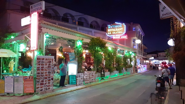 Kommen wir gleich zum dritten Abend meines Korfu-Aufenthaltes. An diesem Kehre ich in der Taverna Mythos ein. Sie nimmt unter den Restaurants in Gouvia eine Sonderstellung ein. Sie hat nicht nur die umfangreichste Speisekarte im Ort, sie hat auch schon am Morgen geöffnet. Gerade Briten bekommen hier ein ausgiebiges Englisches Frühstück, es gibt aber auch Waffeln, Kuchen, verschiedene Eiergerichte und dergleichen mehr.