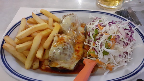 Was mache ich also hier? Es war nicht das Ambiente, das eher an exzessiven Drogenkonsum während im Fernsehen Ben Hur läuft erinnert. Es war das mir bis dato völlig unbekannte Gericht „Gondola“, was mich in seinen Bann zog. Versprochen wurde mir Kalbfleisch auf Aubergine mit Käse überbacken. Ich bin ja nicht prinzipiell der Meinung, dass Fleischkonsum Mord ist, Kalbfleisch aber so zuzubereiten ist es aber bestimmt. Zwei steinharte Fleischtrümmer auf bitterer Aubergine mit schwarzer, zäher, ungenießbarer Haut. Dazu kalte Pommes und Rohkost – ohne Essig, Öl oder Gewürze. Kein Wunder, dass der Koch auch gleich die Laubsäge mit dazulegt.