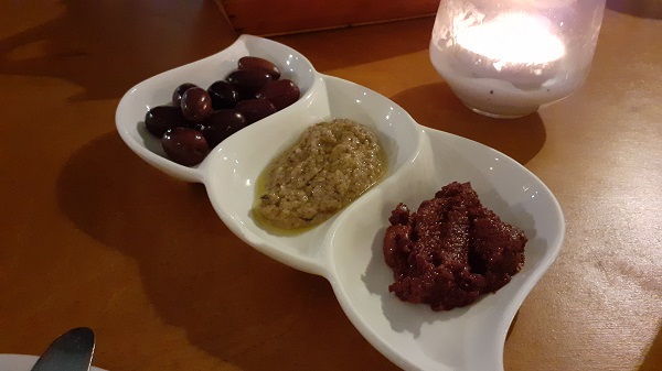 Etwas Hunger sollte man schon mitbringen. Im gehobenen Preis inkludiert ist nämlich eine kleine Vorspeise: Oliven von der Insel, zwei Dipps und frisches Weißbrot. So einfach es aussieht, so lecker ist es. Drei Geschmäcker, drei kleine Köstlichkeiten. Das machte Lust auf mehr.
