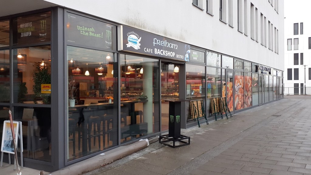Inzwischen gibt es immer mehr Backshops, die auch mehr oder weniger gemütliche Sitzgelegenheiten anbieten. Der Backshop Freiham gehört dazu. Aufgrund seiner Lage direkt am S-Bahnhof und neben dem Eingang zu Ärztezentrum gibt es natürlich viel Laufkundschaft. Trotzdem gibt es einen zwar funktional aber doch ansprechend gestalteten Sitzbereich. Die großen Fenster lassen viel Licht herein und man hat einen Blick auf den Bahnhof. Dahinter liegt Bauerwartungsland, doch noch ist die weitere Aussicht unverbaut.