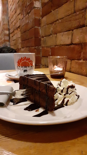 Ich habe mich für einen „Chai Presso“ entschieden, ein Chai Latte mit Espresso, dazu ein Stück Sachertorte. Das Tortenstück hat mich angenehm überrascht, gehört es doch zu den gelungeneren Variationen des Klassikers. Nur die zusätzliche Schokosauce hat mich verwundert. Zu viel des Guten! Zeit noch ein paar Worte über die Inneneinrichtung zu verlieren. Ich fand einen schönen Platz im „Wintergarten“. Mir gefielen vor allem die warmen Farben und die originalen Backsteinwände. Eine schöne Möglichkeit ein historisches Gebäude zu erhalten und gleichzeitig Platz für zeitgemäße Gastronomie zu schaffen. Das war bestimmt nicht mein letzter Besuch hier im Alex.