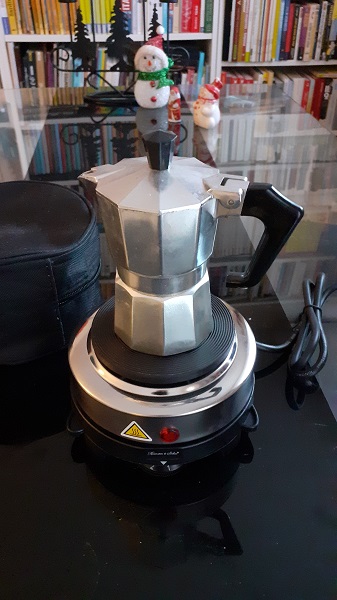 Eine ganze Kaffeemaschine mitzunehmen wäre mir zu umständlich. So eine kleine Kochplatte findet in jedem Reisgepäck Platz. Ein Töpfchen mit Stiel finde ich zur Not für 1,99 € im lokalen Supermarkt, wo ich auch meinen Kaffee bekomme. Ja, das ist ein kleines Stück Unabhängigkeit.