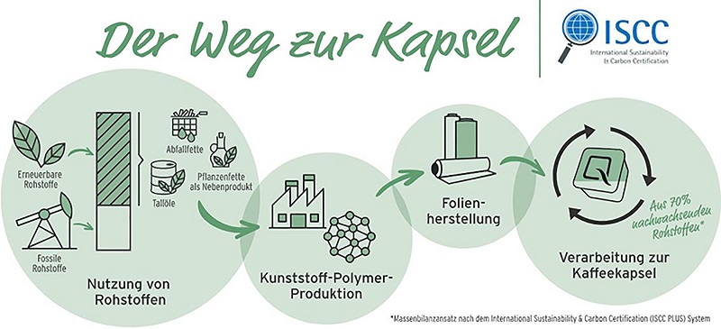 Die neue Qbo Bio-Kunststoffkapsel ersetzt fossile Rohstoffe durch erneuerbare Materialien: Dies verringert die CO2-Emissionen jeder einzelnen Kapsel gem. des Ökobilanzberichts 2021 der TU Berlin um ca. 35 Prozent. Der Anteil der nachwachsenden Rohstoffe wird über einen Massebilanzansatz zugeführt, der durch das International Sustainability and Carbon Certification (ISCC PLUS) System zertifiziert ist. ISCC ist ein besonders fortschrittliches Programm und gilt als erste Zertifizierung für Biomasse und Bioenergie.