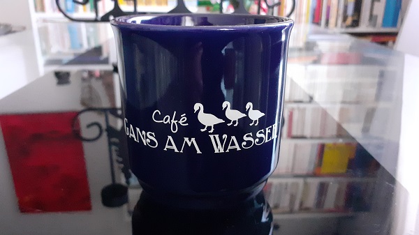 Auf dem Rückweg vom Corona-Test blitzte mir neben dem Mülleimer vor dem Eingang der U-Bahn-Station Theresienwiese etwas Blaues entgegen. Bei genauerem Hinsehen entpuppte sich der blaue Gegenstand als eine Tasse, genauer gesagt eine Glühwein-Tasse vom Gans am Wasser aus dem nicht ganz so nahen Westpark. Immerhin lagen mehr als zwei Kilometer zwischen den beiden Orten, die nicht durch eine U-Bahn- oder Buslinie direkt miteinander verbunden sind.