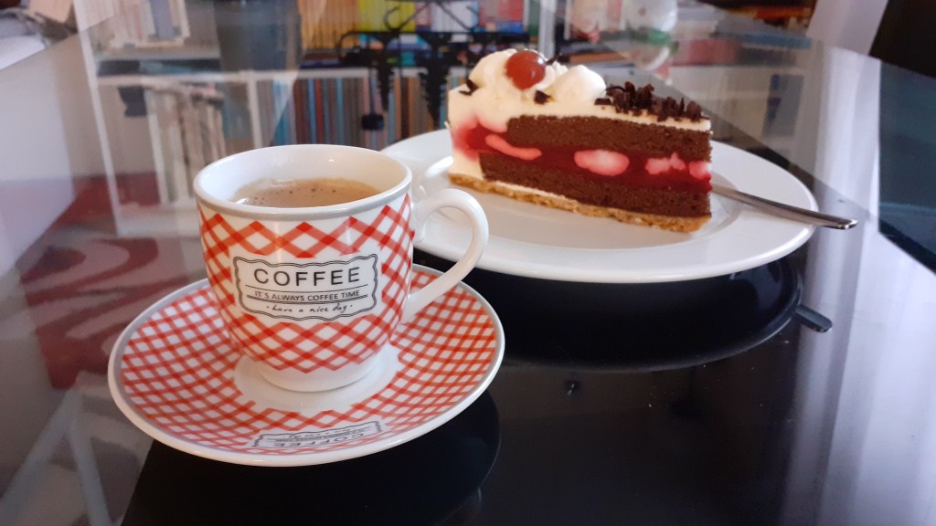 „Black Forest“ ist übrigens eine der am meisten verbreiteten Kuchen- und Tortenvariante. Ich habe Gebäckstücke mit diesem Namen auf dem Balkan, in Griechenland und sogar in Kenia gesehen – und gegessen. Mag die Ähnlichkeit zum Original auch manchmal eher entfernt sein, lecker sind sie allemal. Und eine Frage beantworte ich auch gleich noch mit: ja, griechischer Mokka und Schwarzwälder Kirsch passen hervorragend zusammen! Für heute meine Coffee Time!