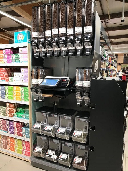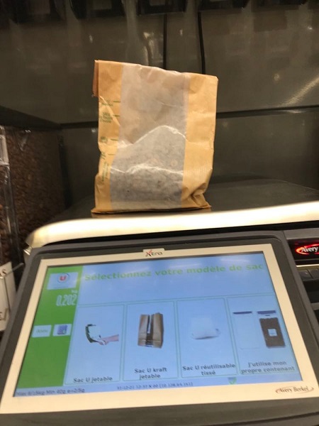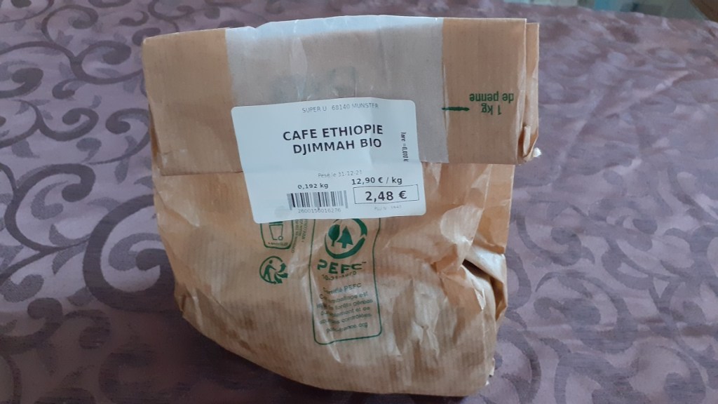 Meine Instaberaterin Anne brachte mir einen Kaffee aus Frankreich, genauer gesagt aus einem Supermarkt im Elsass mit. Dort gibt es, wie man hier sehen kann, offenen Kaffee im Verkauf – zum Selbstabwiegen und Etikettieren. Wie wir das hierzulande schon mit Obst und Gemüse machen, nur eben mit Kaffee. Eine überzeugende Idee.