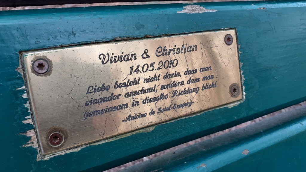 This bench in the English Garden bears an inscription by the donor: „Love isn’t looking at each other, it’s looking together in the same direction.“ These words come from the poet and writer Antoine de Saint-Exupéry, the creator of „The Little Prince“.