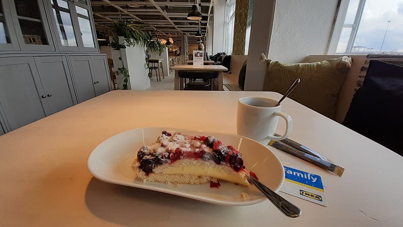 Auf den heutigen Kaffee lädt mich IKEA ein. Mit der IKEA-Family-Card gibt es den nämlich gratis. Eigentlich wollte ich nur bei der günstigen Tankstelle hier Diesel nachfassen. Es ist früher Vormittag und der Andrang gering. Also schnell eine Kaffee-Pause anberaumt. Und diesem Waldbeerenkuchen konnte ich dann auch nicht widerstehen. Warum auch? Dafür lasse ich den Hot Dog aus…
