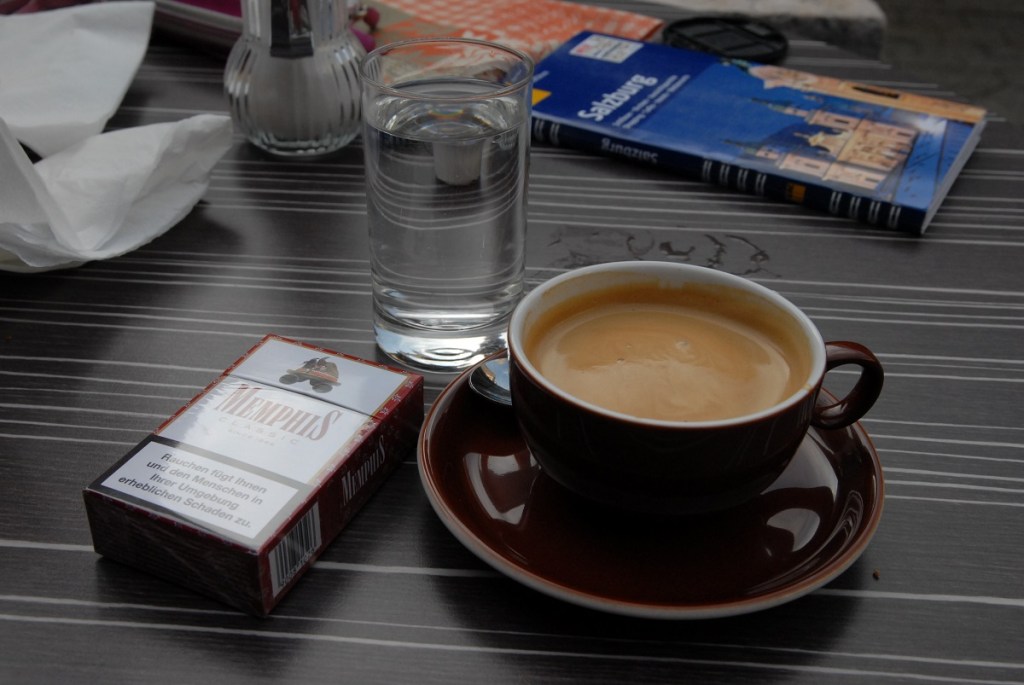 Kaum zu glauben, dass dieser Moment schon wieder acht Jahre zurückliegt. Der Kleine Grünmarkt ist ein kleiner Markt in Salzburg, ein Elisabeth- oder Viktualienmarkt in ganz klein. Seit 1901 haben sich hier um den Marktbrunnen fünf Branchen in festen Verkaufshütten angesiedelt – mit wechselnder Besetzung. Damals – also in Frühjahr 2014 – gehörte zu den Markständen auch eine Bäckerei. Ein idealer Ort für ein schnelles und unkompliziertes Frühstück. Und natürlich für eine Tasse Kaffee und einen Tschick…