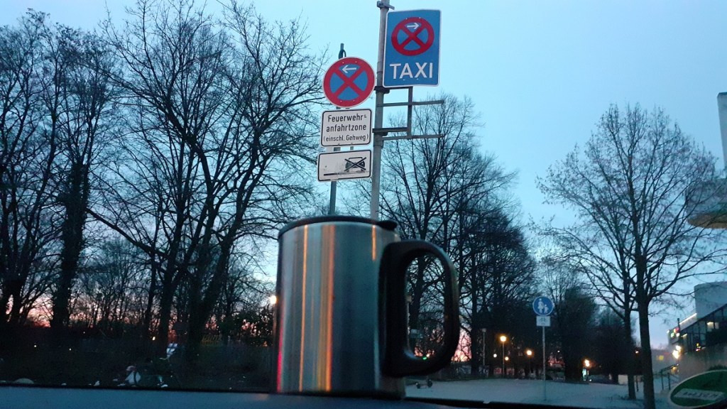 Aschermittwoch – und eine neue Arbeitswoche beginnt. Eine krapfenlose. Vom Taxistand an der Theresienhöhe beobachte ich, wie sich hinter der Altstadt und über der Theresienwiese sich der Himmel langsam verfärbt. Der Sonnenaufgang kündigt sich an. Die Glut über den Dächern der Stadt vertreibt das Blau und schafft Platz für den lichten Tag. Zeit für eine gediegene Tasse Kaffee. Wann, wenn nicht jetzt?