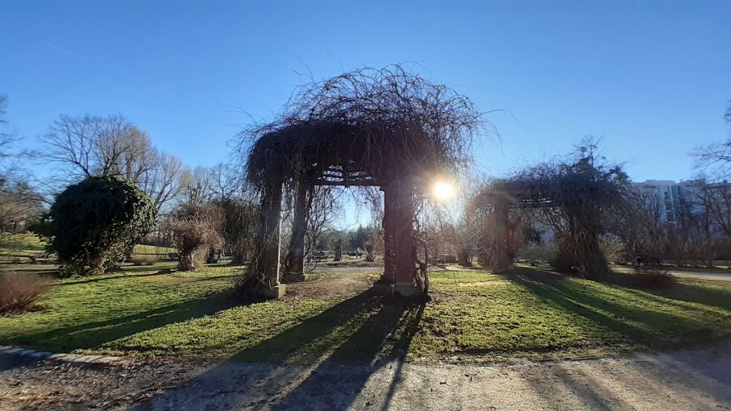 Ob Sommer, ob Winter, mein Naherholungsgebiet ist der Westpark. Obwohl es Plätze gibt, die ich nur bei warmen Wetter aufsuche, zum Beispiel solche, die sich für ein Kaffeepicknick eignen, gibt es auch Orte, die von mir ganzjährig aufgesucht werden, etwas Sonne vorausgesetzt. Das Rondell am Mollsee ist so einer. Besonders mit dem Blick auf die stilisierte Ruine eines – na was eigentlich? Eines Tempels? Eines Schlosses? Man weiß es nicht. Muss man auch nicht wissen.