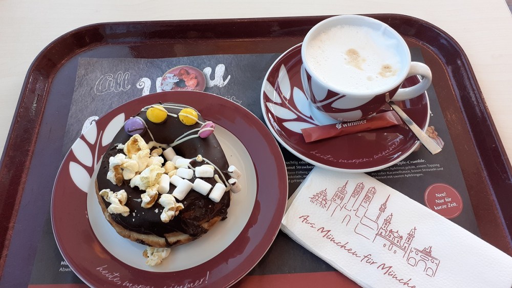 Der letzte Donut in der Runde der Wimmer-Highlights, der Donut Nutella-Sweets: Mit feiner Nutella-Füllung und einem bunten Topping aus Schokolade, Popcorn, Schokolinsen und fluffigen Marshmallows. Zur Feier des Tages habe ich mich in einer Wimmer-Filiale niedergelassen und zum leckeren Süßgebäck einen Cappuccino geordert. Auch, wenn ich das Gefühl habe, dass auf meinem Teller ein Kindergeburtstag explodiert ist, schmeckt mir diese Mischung aus Teig, Nutella und crunchigem Süßkram. Ein würdiges Finale!
