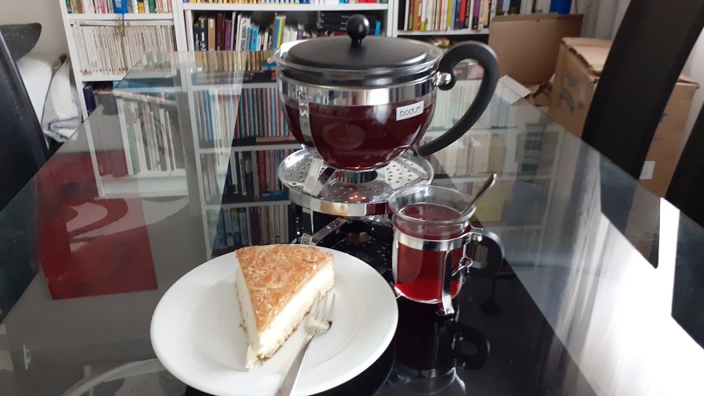 Über den Nordischen Beerentee habe ich ja schon berichtet. Dazu passt ein Stück leckerer Bienenstich. Dabei harmoniert der beerige Tee natürlich prima mit dem schlichten Kuchen. Ein klassischer Tee-Moment, eine Möglichkeit zum Durchatmen – Tee-Hygge! Und das ganz ohne Koffein! Na, wenn dieser neue Blog so lecker startet, dann kann das ja nur alles super werden!