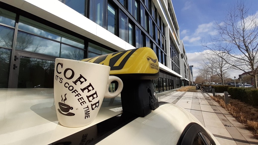Vorbestellung bei Microsoft für 10:40 Uhr. Nachdem ich mich drinnen am Empfang gemeldet habe, bleiben mir noch elf Minuten. Die Sonne scheint gerade zu schön – wenn das keine gute Gelegenheit ist für eine gepflegte Kaffee-Pause? Also habe ich einen Kaffee aus meiner Thermoskanne ausgeschenkt und genieße für ein paar Minuten das Heißgetränk und die warme Sonne. Könnte ja zum Flughafen gehen, da stärke ich mich lieber vorher. Doch egal, wo es nachher hingeht, dieser Kaffee-Moment ist perfekt!