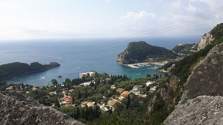 Doch bevor es an die Küste geht biegen wir rechts ab. Hier schraubt sich die Straße in aberwitzigen Kurven den steilen Hang hinauf. Schon bald hat man einen schönen Blick auf die fünf Buchten von Paleokastrítsa, doch es geht höher und höher und damit zu immer atemberaubenderen Panoramen. Busfahrer möchte ich hier nicht sein!