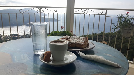 Schon der Blick von der Terrasse ist die Reise wert. Praktisch der Balkon des Balkons des Ionischen Meeres. Hier könnte man eigentlich für den Rest des Urlaubs bleiben und die Aussicht genießen. Apropos genießen: zu unserem griechischen Kaffee nehmen wir das letzte Bougatsa des Tages. Und das Internet hat nicht zu viel versprochen: es ist lecker.