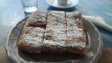 Knuspriger Blätterteig mit einer süßen Crèmefüllung und – als wäre das alles nicht schon süß genug – natürlich unter einer Schicht Puderzucker. Dagegen schmeckt der griechische Kaffee „metrio“, also mit nur einem Löffel Zucker, fast herb. Und das Wasser erleichtert es einem das ganze herunter zu bringen.