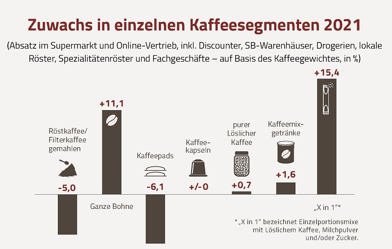 Löslicher Kaffee war 2021 mit seinen verschiedenen Darreichungsformen für die Zubereitung zu Hause erneut sehr gefragt. Der Absatz im Lebensmitteleinzelhandel legte gegenüber 2020 in allen Bereichen zu. Vor allem die Einzelportionssticks mit Milch und/oder Zucker, auch bekannt als „X in 1, verzeichneten mit einem Absatzplus von 15,4 Prozent deutliche Gewinne. Lösliche Mixgetränke, z. B. „Typ Cappuccino“, stiegen um 1,6 Prozent. Der pure Lösliche Kaffee erzielte ein Plus von 0,7 Prozent.