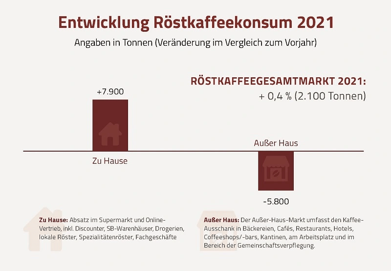 Im zweiten Jahr der Pandemie setzte sich der Rückgang im Außer-Haus-Markt für Kaffee fort, jedoch auf einem geringeren Niveau als 2020. Das Gesamt-Segment Out-of-Home verlor 5,7 Prozent (minus 5.800 Tonnen Röstkaffee) gegenüber dem Vorjahr. Die größten Einbußen verzeichneten (Hotel-)Restaurants (minus 25 %), Cafés (minus 15 %) und Kioske (minus 14 %). Gewinne vermeldeten unter anderem Coffeeshops (plus 25 %), Schnellimbisse/Fast Food Restaurants (plus 61 %) und Bäckereien (plus 3 %).