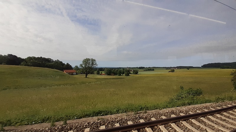 Schon schön, unser Bayern! Gell? Der Zug eilt über unsere schönen bayerischen Felder, Wiesen und Auen. Das kann sich schon sehen lassen. Zur Erinnerung: ich sitze im Zug von München Richtung Füssen mit dem ersten geplanten Ausstieg in Weizern-Hopferau. Und schon die liebliche Landschaft im hellen Grün des Frühsommers entschädigt mich für das frühe Aufstehen.