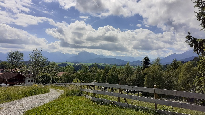Schon nach wenigen Schritten im Dorf weist uns ein leicht in die Jahre gekommenes Schild den Berg hinauf. Mit jedem Meter Höhe, die wir gewinnen, wird auch der Blick vielversprechender. Ein liebliches Tal erstreckt sich am Fuße des Berges. Die gute Sicht erlaubt den Blick bis nach Füssen, ja in der Ferne lassen sich sogar Füssen und darüber Neuschwanstein ausmachen. Wie wird das erst oben am Gipfel sein?