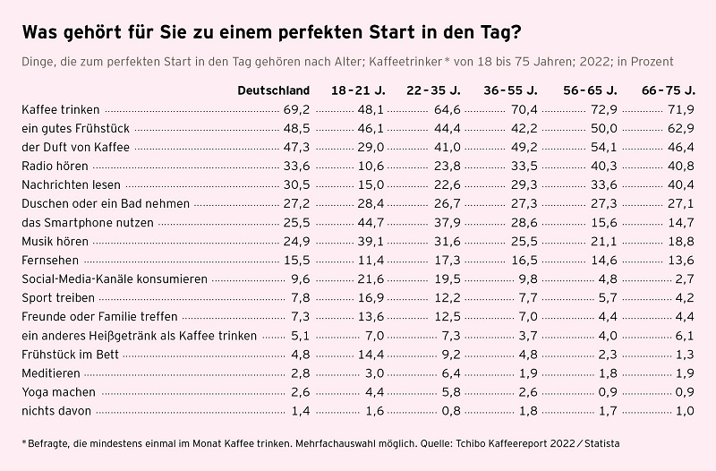 Für 69,2 Prozent der Deutschen gehört Kaffee trinken zum perfekten Start in den Tag – noch vor dem Frühstück (48,5 %) oder einer Dusche (27,2 %). Das ergab die repräsentative Umfrage unter 5.000 Kaffeetrinkenden, die Tchibo zusammen mit brand eins und Statista für den Tchibo Kaffeereport 2022 durchgeführt hat. Schwerpunkt der 11. Ausgabe ist in diesem Jahr das Thema „Neubeginn“.