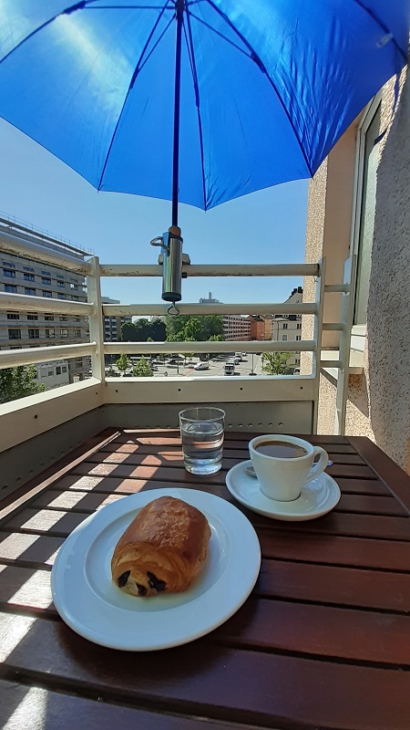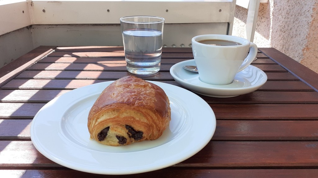 Und das half: kaum waren die Schirme aufgespannt, sank die Balkontemperatur auch schon auf angenehme 24°. Kann also losgehen mit dem Frühstück. Diesmal einen „Café crème“ und dazu ein Chocolatine – auch Pain au chocolat – genannt. Also ein „petit déjeuner“, wie es im Buche steht. Zum Beispiel in einem der Dupin-Krimis aus der Bretagne.