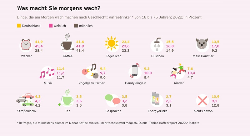 Vier von zehn Mitmenschen lassen sich morgens von ihrem Wecker aus der Traumwelt in die Realität befördern. Etwa gleichviel werden erst mit Kaffee richtig wach. Das ist eine der Erkenntnisse aus dem Tchibo Kaffeereport 2022, der in Kooperation mit brand eins und Statista entstanden ist. Demnach lässt sich jeder Vierte von der Sonne wecken, jeder Sechste braucht zum wachwerden eine Dusche und bei jedem Zahnten übernimmt das das Haustier – dicht gefolgt von Kindern.