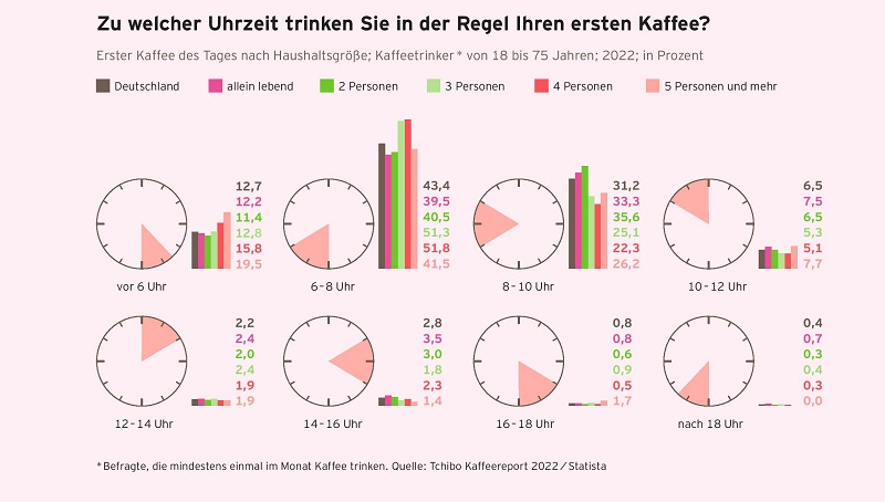 Dazu passt, dass fast die Hälfte aller Befragten ihre erste Tasse Kaffee zwischen 6:00 und 8:00 Uhr trinken, jeder Dritte ist zwischen 8:00 und 10:00 Uhr dran. Nur 12,7 % kommen noch vor 6:00 Uhr zu ihrem Kaffee – vermutlich bedingt durch frühes Aufstehen. Nur eine Minderheit hebt sich das erste koffeinhaltige Heißgetränk für die Zeit nach 10:00 Uhr auf, in der zweiten Tageshälfte sind das sogar nur noch 6,4 % – je später der Tag, desto weniger…