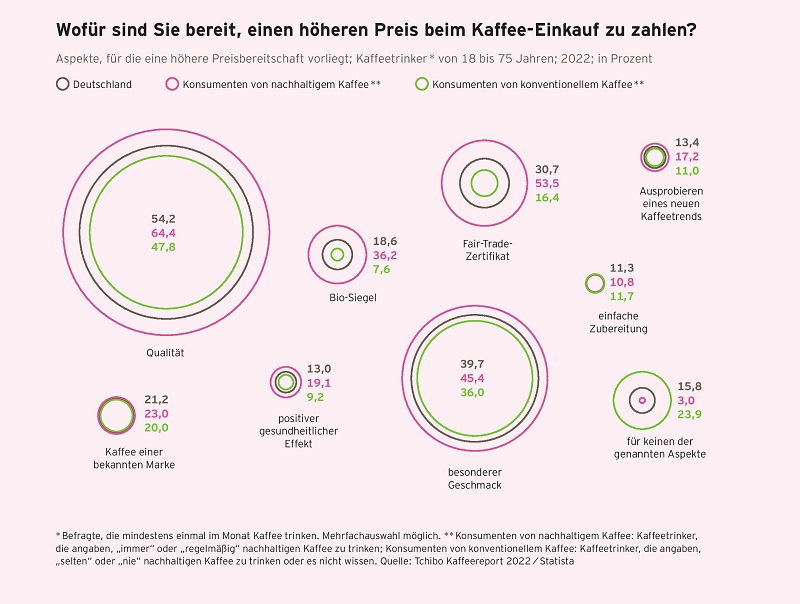 Ob und wieviel man bereit währe mehr für ein Kilo Kaffee zu bezahlen, hängt von verschiedenen Faktoren ab. Dabei sind die Konsumenten von nachhaltigem Kaffee wählerischer, wie die von konventionellem Kaffee. Für 54,2 % aller Kaffeetrinker wäre eine bessere Qualität ein Argument für einen höheren Preis. Für 39,7 % hingegen wäre ein besonderer Geschmack ausschlaggebend. Nur jeder Dritte achtet auf ein Fair-Trade-Zertifikat, bei den Konsumenten nachhaltigen Kaffees immerhin jeder Zweite! Für ein Bio-Siegel kann sich nur noch jeder Fünfte begeistern. Bei der Bekanntheit der Marke sind sich alle Kaffeetrinker wieder einig: für ein Fünftel ist dies ausschlaggebend bei der Kaufentscheidung.