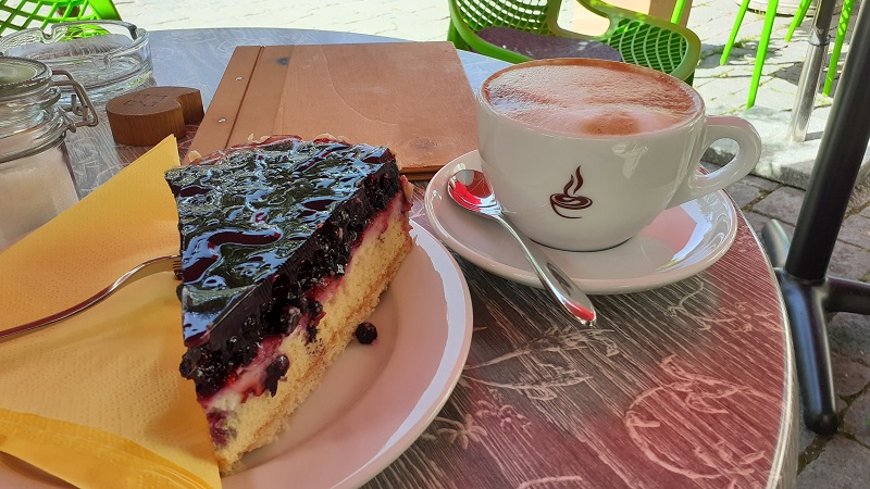 Ein Blick auf die immense Kuchenauswahl und ich entschied mich für eine Blaubeertorte. Dazu ein Cappuccino mit den Bohnen von Supremo aus Unterhaching. Beides ein Gedicht. Dazu der Blick auf den Markt, an dem noch ein paar verbliebene Marktleute ihre Waren zusammenpacken – ein schönes Bild! Betrieben wird das Café von einem netten Ehepaar. Leider muss ich bald wieder weiter, behalte aber das Café am Stadtplatz mit seinen freundlichen Menschen in guter Erinnerung.