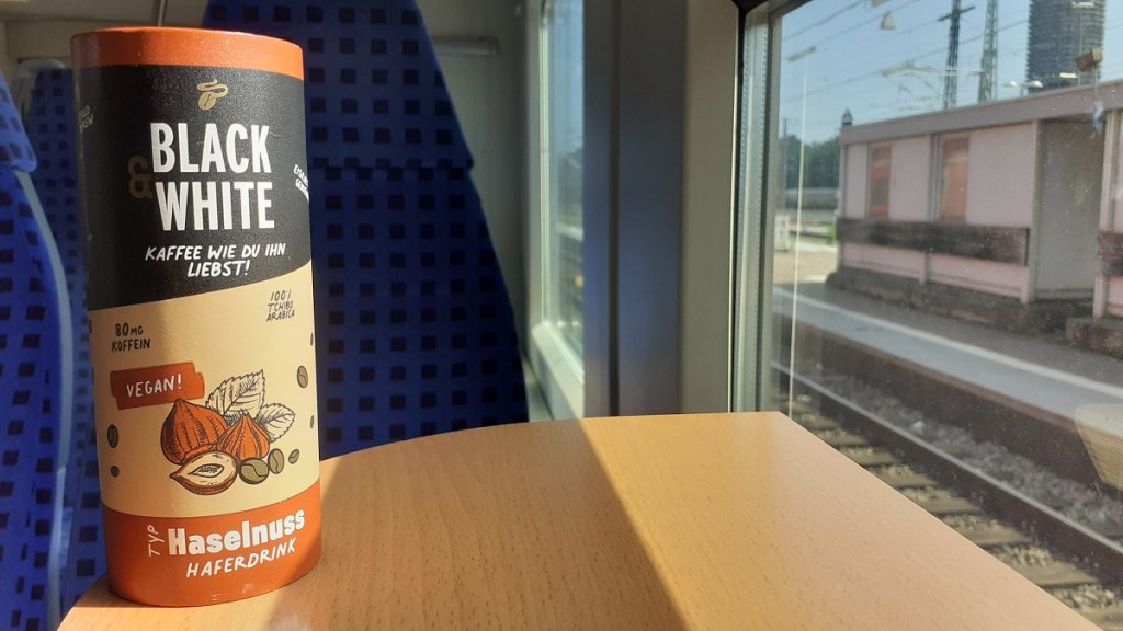 Auf meiner 9-Euro-Ticket-Tour nach Augsburg habe ich natürlich auch einen Kaffee-Begleiter dabei. In diesem Fall den Black & White Cold Brew Typ Haselnuss Haferdrink. Ein Cold Brew aus hell gerösteten Arabica-Bohnen, die 14-Stunden in Wasser ihre Aromen abgeben dürften. Dazu ein veganer Haferdrink statt Milch. Das ganze verfeinert mit einer leichten Haselnussnote. Zusammen unschlagbar. Und ein toller Reise-Begleiter.