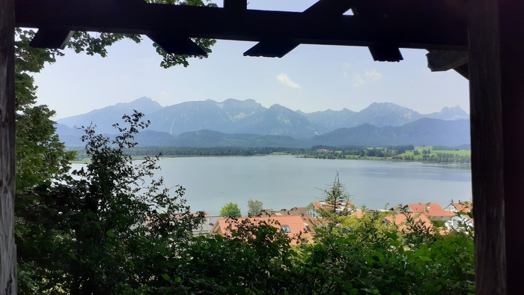 Diese Aussicht habe ich Euch bisher unterschlagen. Vielleicht weil kein Kaffee im Bild ist. Unvergleichlich ist es hier trotzdem. Das Bild entstand auf dem Rückweg von der Burgruine Hopfen zurück zum See. Etwa auf der Hälfte der Stecke liegt diese Schutzhütte mit dem unverstellten Blick auf den See, die Ammergauer Alpen und die Tannheimer Berge. Für eine Kaffeepause ein ganz besonderer Ort!