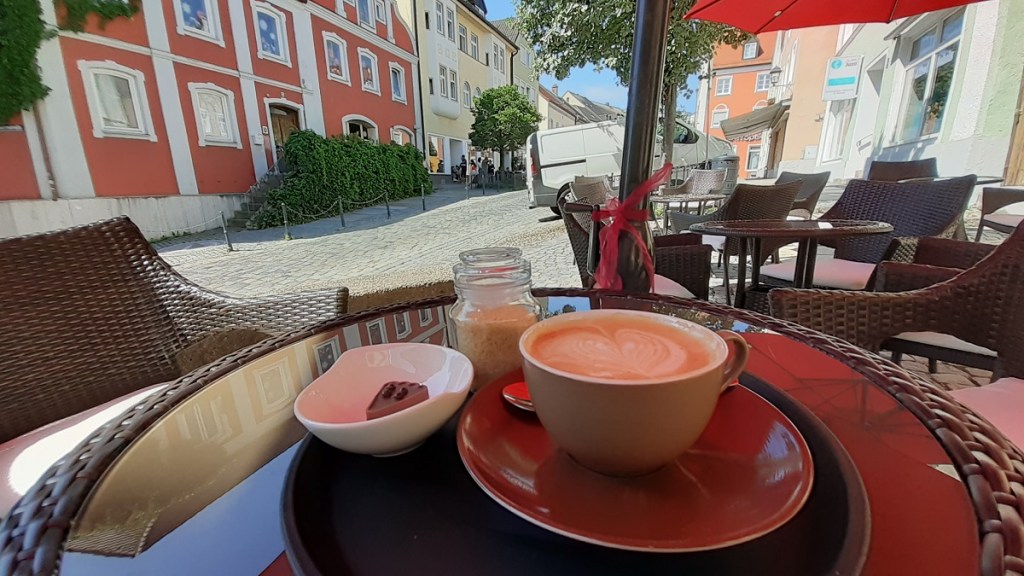 Während ich mir auf der Terrasse vor der Rösterei Bohnenfee in Moosburg an der Isar meinen Cappuccino und meine Praline schmecken lasse stelle ich mir die Frage: wo trinken die Moosburger eigentlich Montags ihren Kaffee? Alle schönen Cafés haben da nämlich Ruhetag. Gut, dass ich an einem Dienstag hier war!