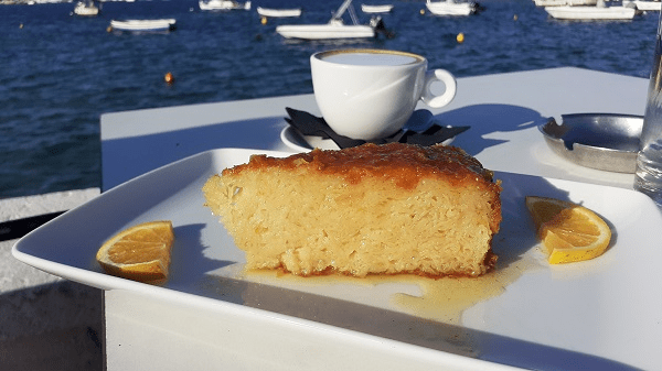 Der erwartet mich im Strandrestaurant Nautilus. Von Mont Repos geht es mit dem Roller zurück durch das Einbahnstraßengewirr. Dann eine scharfe Linkskurve und unvermittelt ist man wieder am Meer. Hier, am Südende der Garitsa-Bucht, erhebt sich Korfus einzig verbliebene historische Windmühle – zumindest die einzige, der ich gewahr wurde – und damit ein außerordentlich beliebtes Fotomotiv. Hier ist auch ein kleiner Jachthafen an deren Anlegern die Bewohner von Kerkyra gerne mal zum Baden herkommen. Ich genieße während dessen einen Cappuccino und ein Stück Orange Pie. Portokalópita, wie er hier heißt, ist ein typisch griechisches Rezept: Es handelt sich dabei um einen Orangenkuchen, der ohne Mehl, dafür aber mit Filoteig hergestellt und anschließend mit Sirup getränkt wird. Er ist schnell gemacht und man isst ihn am besten noch lauwarm in Begleitung mit etwas Schmand.