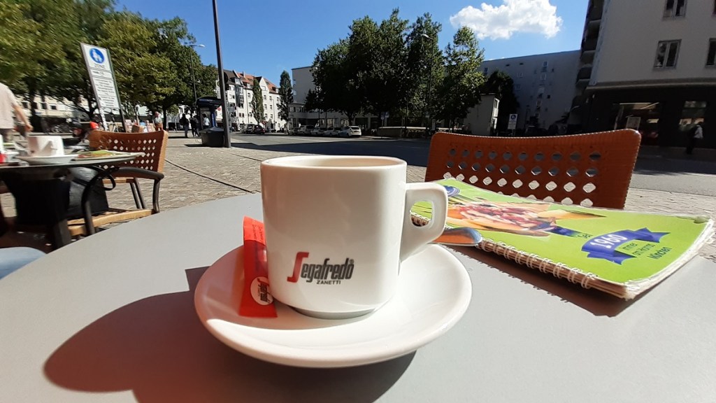 … hat mit Griechenland noch nichts zu tun. Es ist Montag und die Reise geht erst am Donnerstag in aller Frühe los. Da ich natürlich wieder das Wochenende gearbeitet habe, bleiben mir vor meiner Reise aber noch einige Tage Zeit. Also nutze ich das noch schöne, warme Wetter und genieße einen Affogato vor der italienischen Eisdiele Riviera am Harras. So kann der Urlaub langsam losgehen!