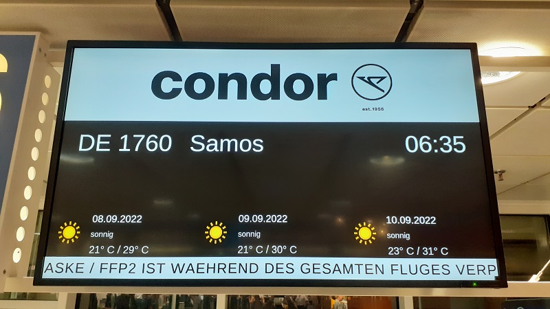 Früh ging es los! Um rechtzeitig am Flughafen zu sein, musste ich um 2:45 Uhr den Nachtbus zur S-Bahn nehmen. Da war an Schlaf nicht viel zu denken. Umso positiver war ich von der Schnelligkeit überrascht, mit der die zuströmenden Reisenden an den Schaltern der Condor mit Bordkarten versorgt wurden. Mit FTI statt mit Tui zu reisen erwies sich so ein weiteres Mal als Glücksfall.