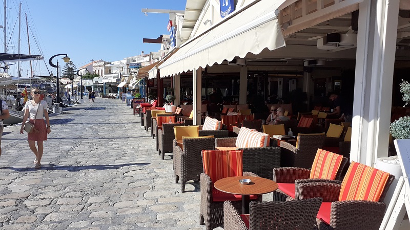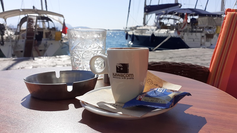 Schnell kommt mein Kaffee und das obligatorische Glas Wasser. Ich nehme einen ersten Schluck. Der Kaffee ist heiß, süß und bitter – wie er sein soll. Ich blinzle in die Sonne und schaue ihr bei ihrem Steigflug zu. An der Hafeneinfahrt kündigt sich eine Fähre an, während Fischer ihre Boote beladen. So fängt ein perfekter Urlaubstag an.