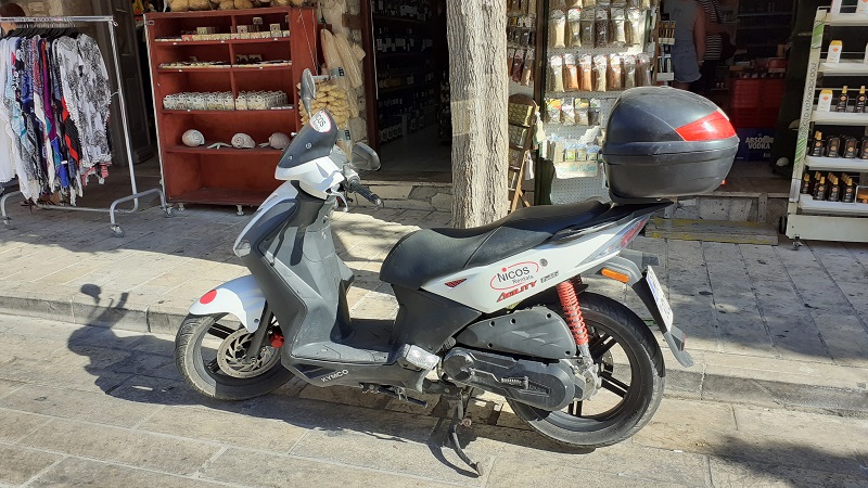 Der nächste Morgen. Meine Schritte führen mich nach dem Frühstück gleich zum Rollerverleih – Nicos Rentals, Filiale Ireon. Eine 125er soll es diesmal sein. Und die bekomme ich auch und eine ausführliche Einweisung noch dazu. Tatsächlich funktioniert bei diesem Roller alles. Alle Lichter, Anzeigen und so weiter. Der Tank ist natürlich fast leer, also ist ein Tankstellenbesuch angesagt.