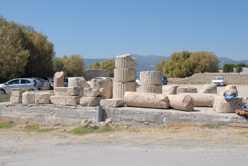 Folgt man der lykourgo logotheti weiter in den Ort hinein, sieht man nach der Grundschule rechter Hand einen Parkplatz. Hier stelle ich meinen Roller erst einmal ab und mache mich zu Fuß auf die Erkundung der Stadt. Und schon hier am Parkplatz findet man Mauern und Fragmente aus der antiken Vergangenheit. Hier stand einst das antike Sportgelände mit Gymnasion, einer Laufhalle mit Sälen für Ring- und Faustkämpfe. Darüber erhebt sich ein Festungswall wohl schon aus dem 18. Jahrhundert. Wer und wann genau er errichtet wurde, konnte ich nicht in Erfahrung bringen. Ein schönes Fotomotiv ist es trotzdem.