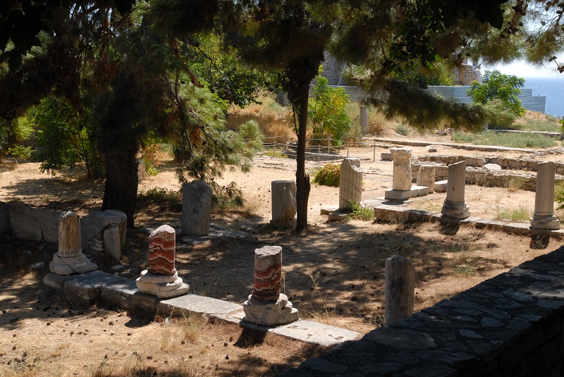 Doch zurück zur Antike. Der begegnet man nämlich in Pythagório auf Schritt und Tritt. Schließlich lag hier die Stadt Samos, die ihre Blütezeit bereits im sechsten vorchristlichen Jahrhundert unter dem Tyrannen Polykrates hatte, Und der entwickelte eine rege Bautätigkeit, deren Spuren noch heute zu sehen sind. Und das beginnt schon, wenn man von Richtung Flughafen in den Ort kommt. Schon türmen sich rechts und links der Straße die ersten historischen Überreste auf. ein Teil der Stadtmauer, die Thermen, ein Friedhof, die Grundmauern von Agora und einer byzantinischen Basilika – alles neben- und übereinander.