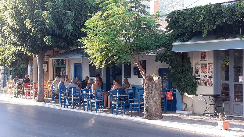 Es gibt keinen Bahnhof in Pythagório. Trotzdem ist „O Stathmos“ das Kafenio der Stadt, ist es doch der Treffpunkt für Samos-Reisende. Wer mit wem und wer überhaupt gerade auf der Insel ist, dieses Café ist Informations- und Nachrichten-Zentrale. Natürlich sitzt man draußen auf blauen Stühlen und an blauen Tischen, schließlich wäre innen dafür auch gar kein Platz, Straßenlärm und Abgase der wichtigsten Kreuzung des Ortes inklusive. Egal in welche Richtung man will, hier muss man vorbei!