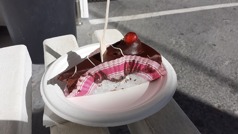 Dabei fiel mir die Wahl wirklich schwer. Torten, Kuchen, Plätzchen, selbstgemachtes Eis, die Auswahl war für eine Konditorei an der Landstraße zwischen Karlovasi und Vathi wirklich sehr groß. Für den Transport weiterer Tortenstücke war es leider zu heiß und der Weg war ja noch weit. Aber dieses Stück Torte werde ich noch länger in Erinnerung behalten.