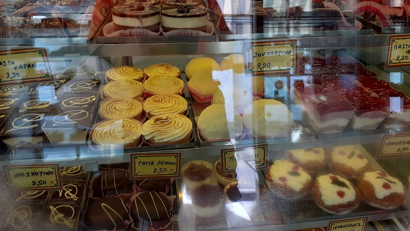 Belohnt wurde ich allerdings, als ich an der Konditorei Kypseli vorbeikam. Die Werbetafel machte mich neugierig, also wendete ich und stattete dem Laden einen Besuch ab. Und tatsächlich fand ich mich in einer mediterranen Konditorei wieder mit allerlei selbstgemachten Köstlichkeiten aller Couleur und Form. Ich entschied mich für ein verlockendes Stück Schokoladentorte – und habe es nicht bereut.