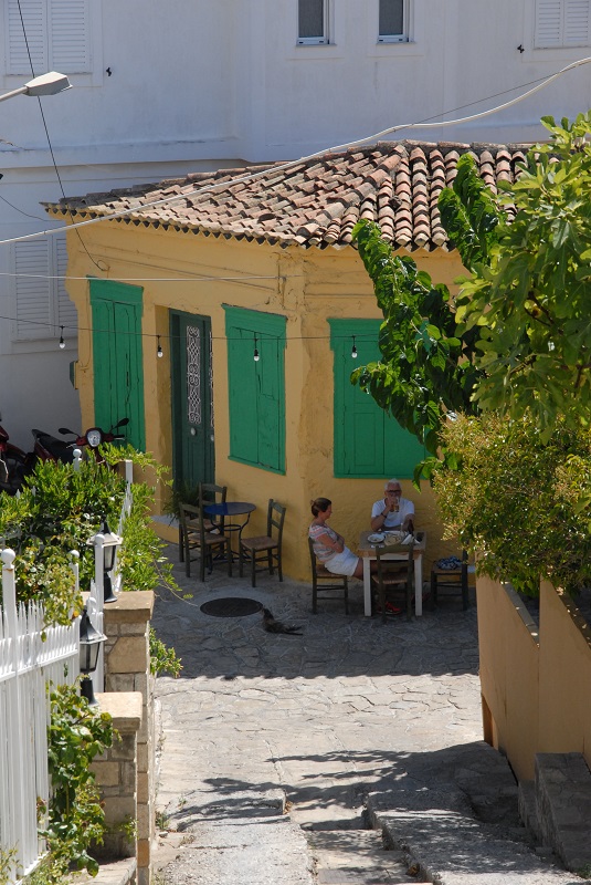 Die Kirche an der Spitze ist tatsächlich neueren Datums und wurde erst vor wenigen Jahren erbaut. Sie ist als einzige von weithin sichtbar. Natürlich geht das auch in Gegenrichtung: von der Kirche hat man den wohl besten Blick auf den Hafen und die Stadt. Der kleine Platz mit den übrigens jahrhundertealten Platanen hat einen Spitznamen. Er wird inoffiziell mikro Parisi, klein Paris genannt.