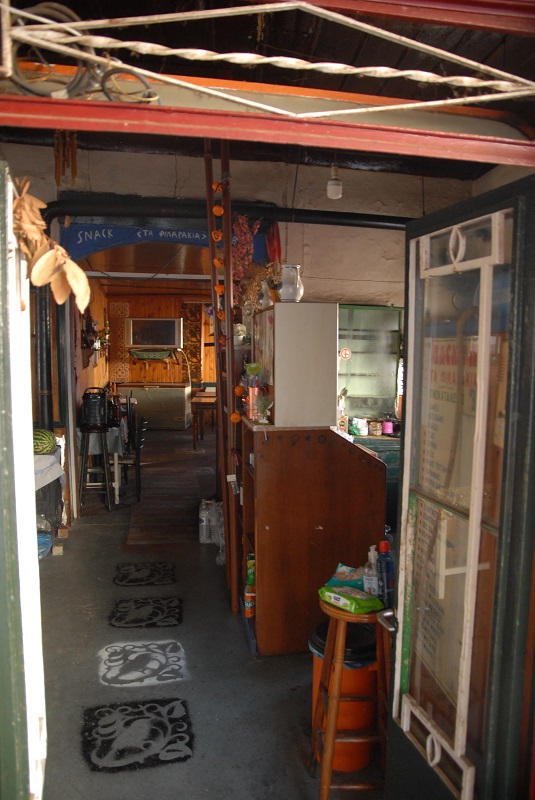 Die Taverna Filikara ist alt. Über dem Türstock prangt die Jahreszahl 1880. Die Einrichtung scheint nicht viel jünger zu sein. Einfach ist es hier, aber schön. Nur der Wirt, ein unrasierter, schmerbäuchiger Mann mit einem schmutzigen schwarzen T-Shirt. Schließlich bequemt er sich zu mir. Ich bestelle in meinem besten Griechisch. Erreichen kann ich damit nichts.