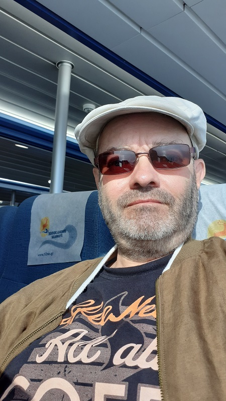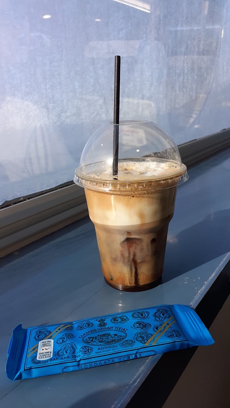 Doch reicht das nicht für die zweieinhalb Stunden Fahrt, weshalb ich in der Bordkantine meinen Proviant ergänze, nämlich um einen Cappuccino freddo und einen kleinen Riegel Pavlidis, der für Griechenland typischen dunklen Schokolade. Das funktioniert, wie man meinem entspannten Gesichtsausdruck – siehe oben – entnehmen kann. Im nächsten Beitrag landen wir auf Patmos.