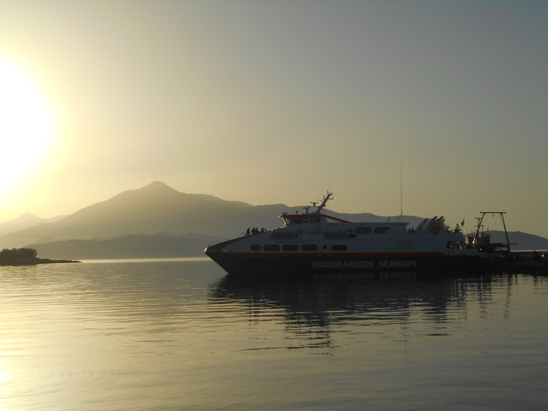 Die Dodekanisos Pride, ein Schnellkatamaran des Typs Sea Lord mit Platz für 280 Passagiere und 9 Fahrzeuge und einer Höchstgeschwindigkeit von 33 Knoten – zum Vergleich: auf dem Starnberger See ist man mit etwa 10 Knoten unterwegs – legt pünktlich ab. Auf der Route nach Patmos liegen noch zwei weitere Inseln, Fourni und Ikaria, zwei weniger besiedelte Eilande und kleinen Häfen. Das Wendemanöver vor dem Anlegen der Fähre ist immer wieder ein Meisterstück.