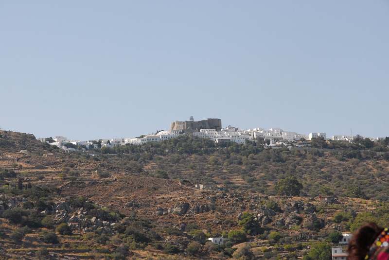 Während Hölderlin nie auf Patmos war, nähere ich mich der Insel schon zum zweiten Mal – das erste Mal liegt über 30 Jahre zurück – auf dem einzig möglichen Weg: per Schiff. Patmos hat keinen Flugplatz. Und so wird schon die Ankunft zum Erlebnis. Sanft steigt die karge Insel aus dem morgendlichen Dunst herauf und schon bald sieht man auf dem höchsten Punkt der Insel, so scheint es, die tausendjährigen Mauer des Klosters, dass die ganze Insel zu beherrschen scheint: das Kloster des Heiligen Johannes des Theologen.