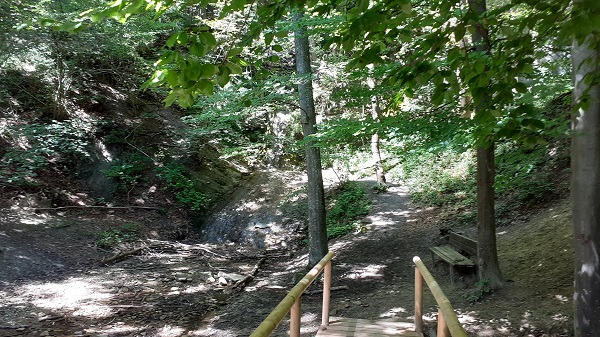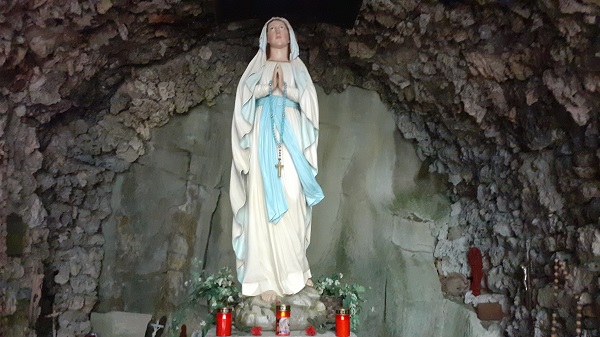 Finden wir doch noch einen weiteren heiligen Ort praktisch am Wegesrand. Naja, ein wenig steigen müssen wir schon, nämlich hinab in den steilen Hang eines Bachufers in einer Waldschlucht. Hier liegt eine Grotte mit einer Quelle, die 1893 aufwendig als Lourdes-Grotte ausgebaut wurde. Damals stifteten Anton und Therese Mayr diese Tuffstein-Grotte mit Lourdes-Madonna. Nach den Marienerscheinungen im Jahre 1858 im französischen Lourdes wurden Ende des 19. Jahrhunderts vielerorts in Europa Mariengrotten errichtet. Bereits am 21. März 1815 hat Papst Pius VII. Maiandachten nicht nur gutgeheißen, sondern sogar mit großen Ablässen begnadigt. Diese Nachlässe zeitlicher Sünden-Strafen konnten fürbittweise auch den armen Seelen im Fegefeuer zugewendet werden, um schneller in den Himmel zu gelangen.